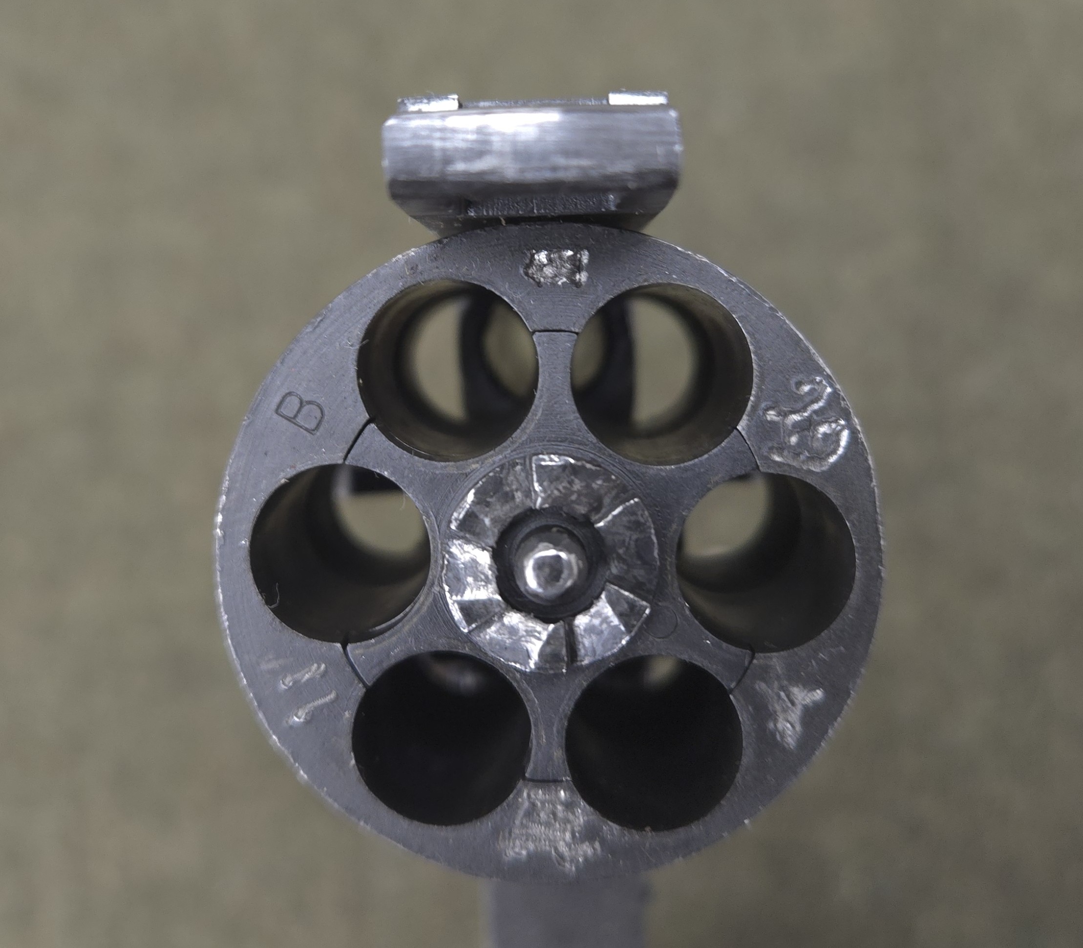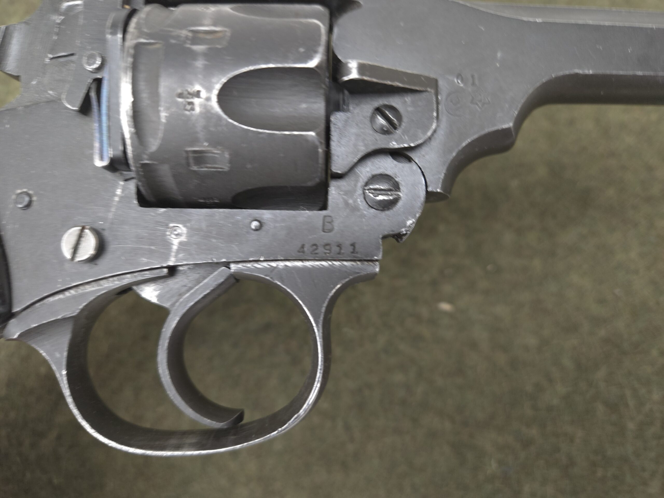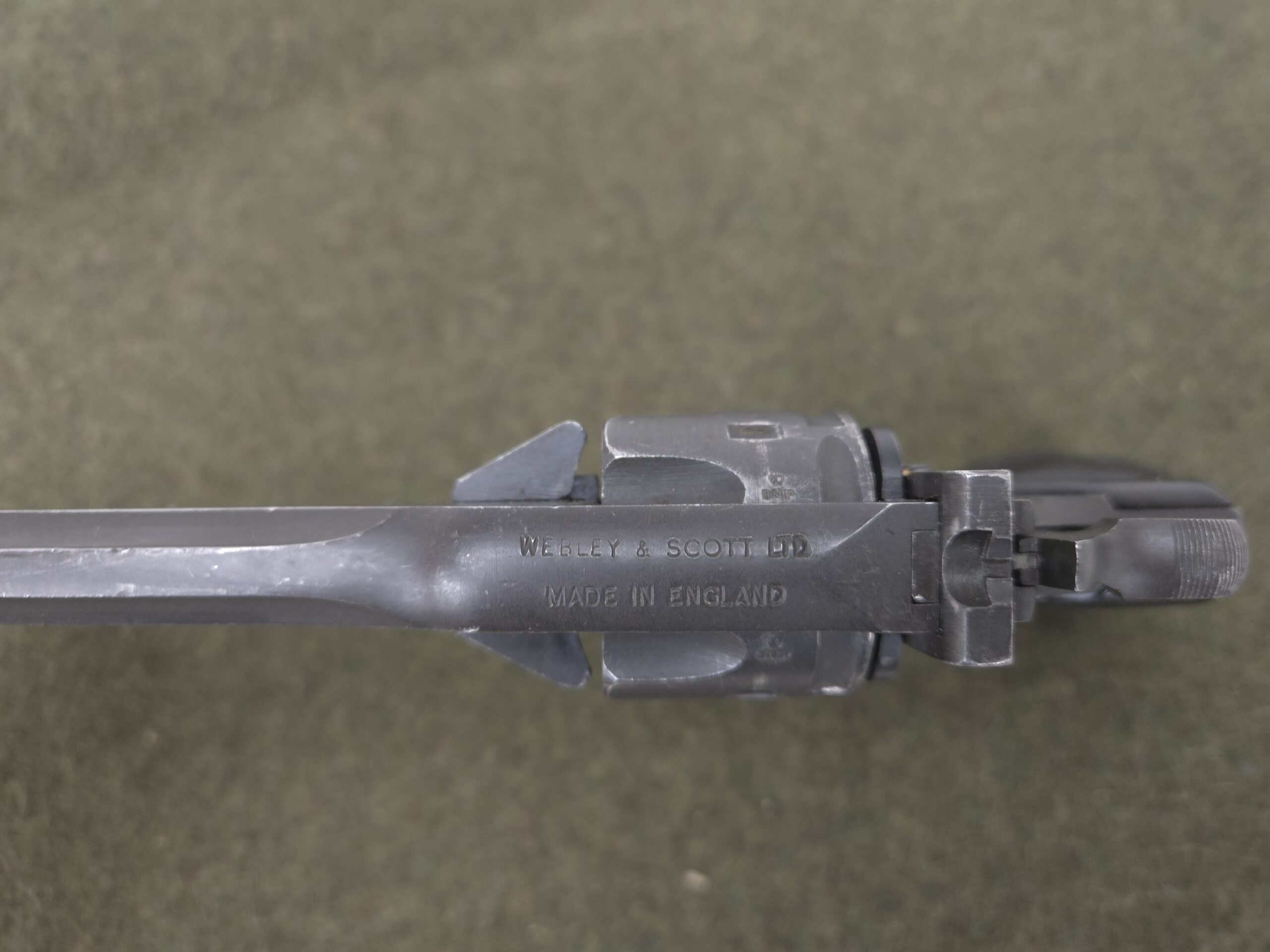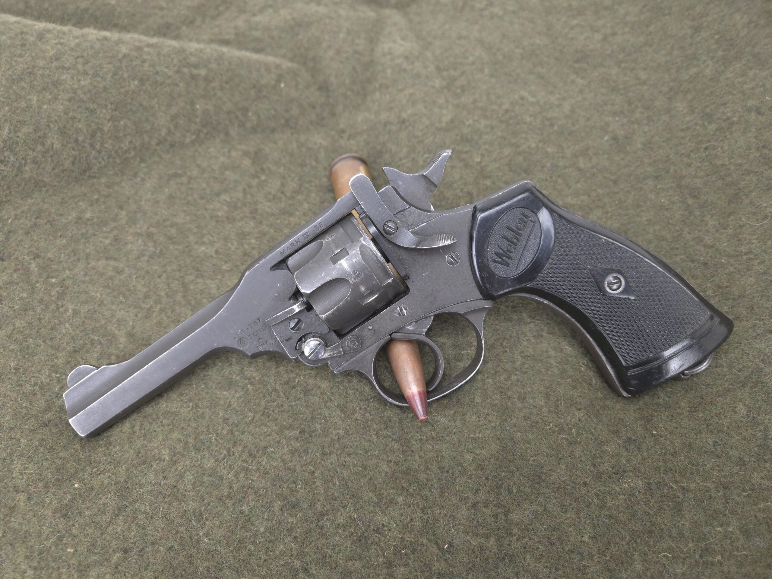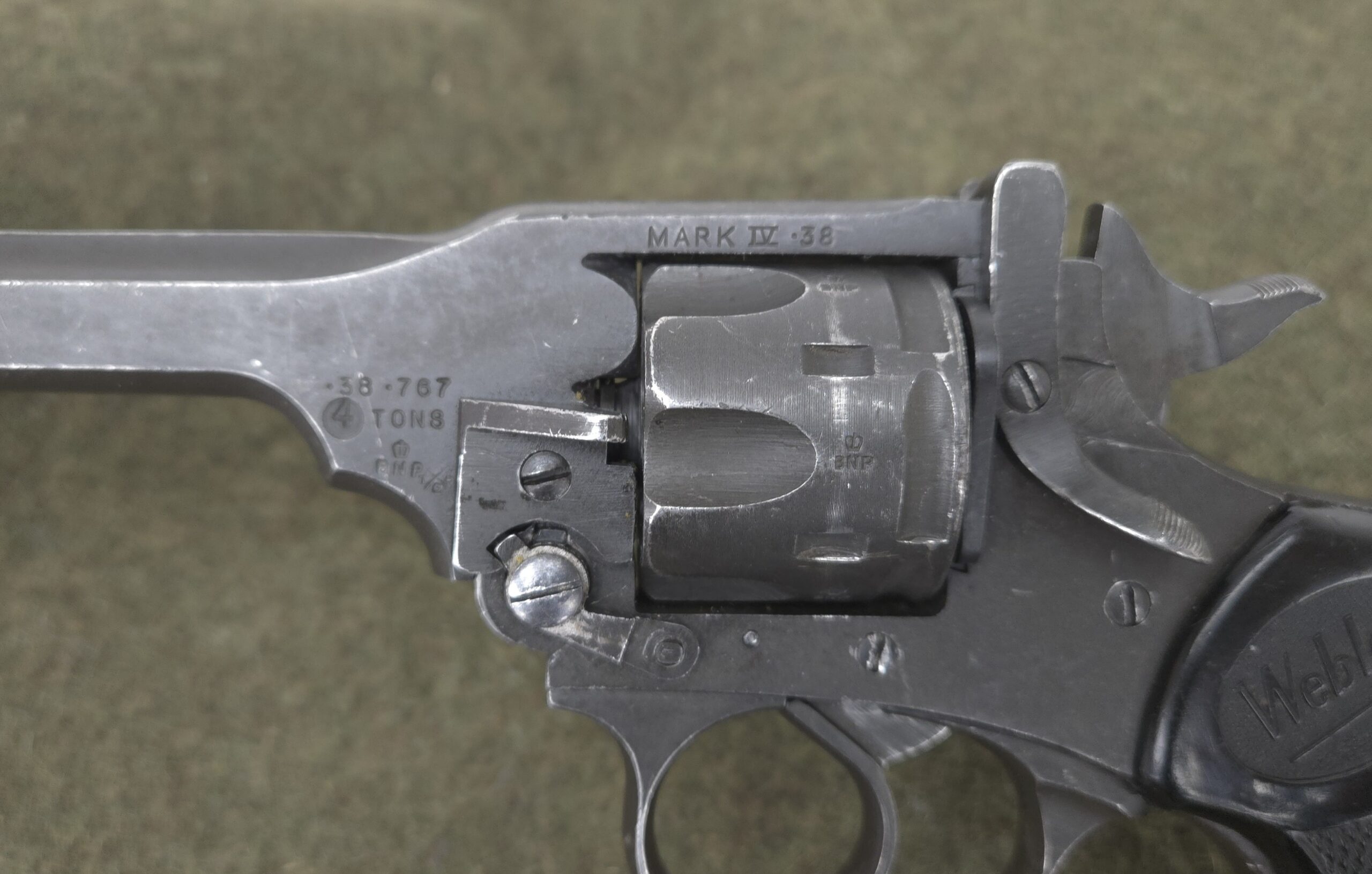 This is a very nice all original British Webley Mark IV Revolver chambered in 38/200 also known as 38 S&W. Mechanically this revolver is in excellent working order and is sure to be a great shooter. This revolver is British export marked and is commercially import marked at the end of the barrel. The 4″ barrel has an excellent bore. This revolver will make an excellent addition to any WWII collection!
