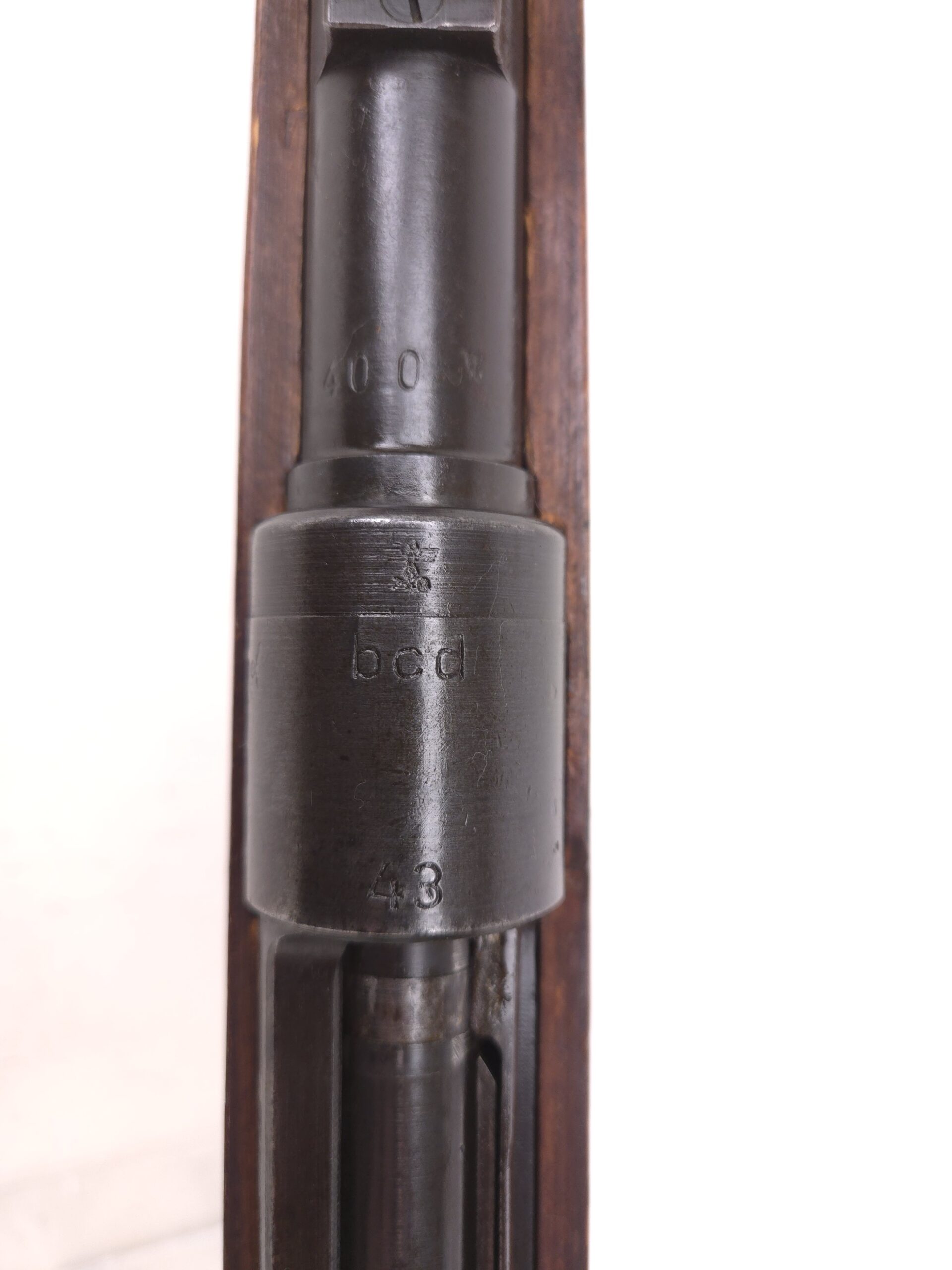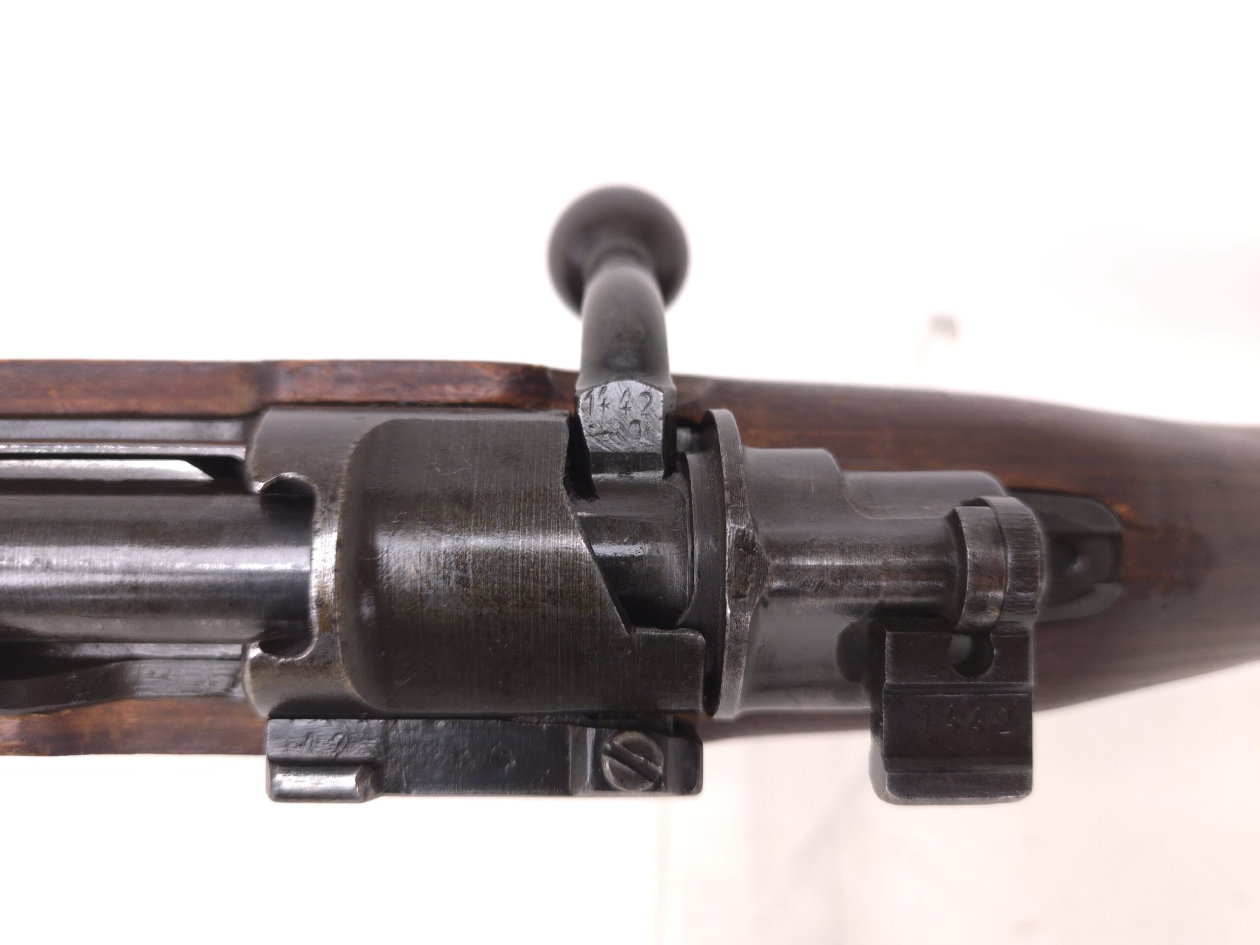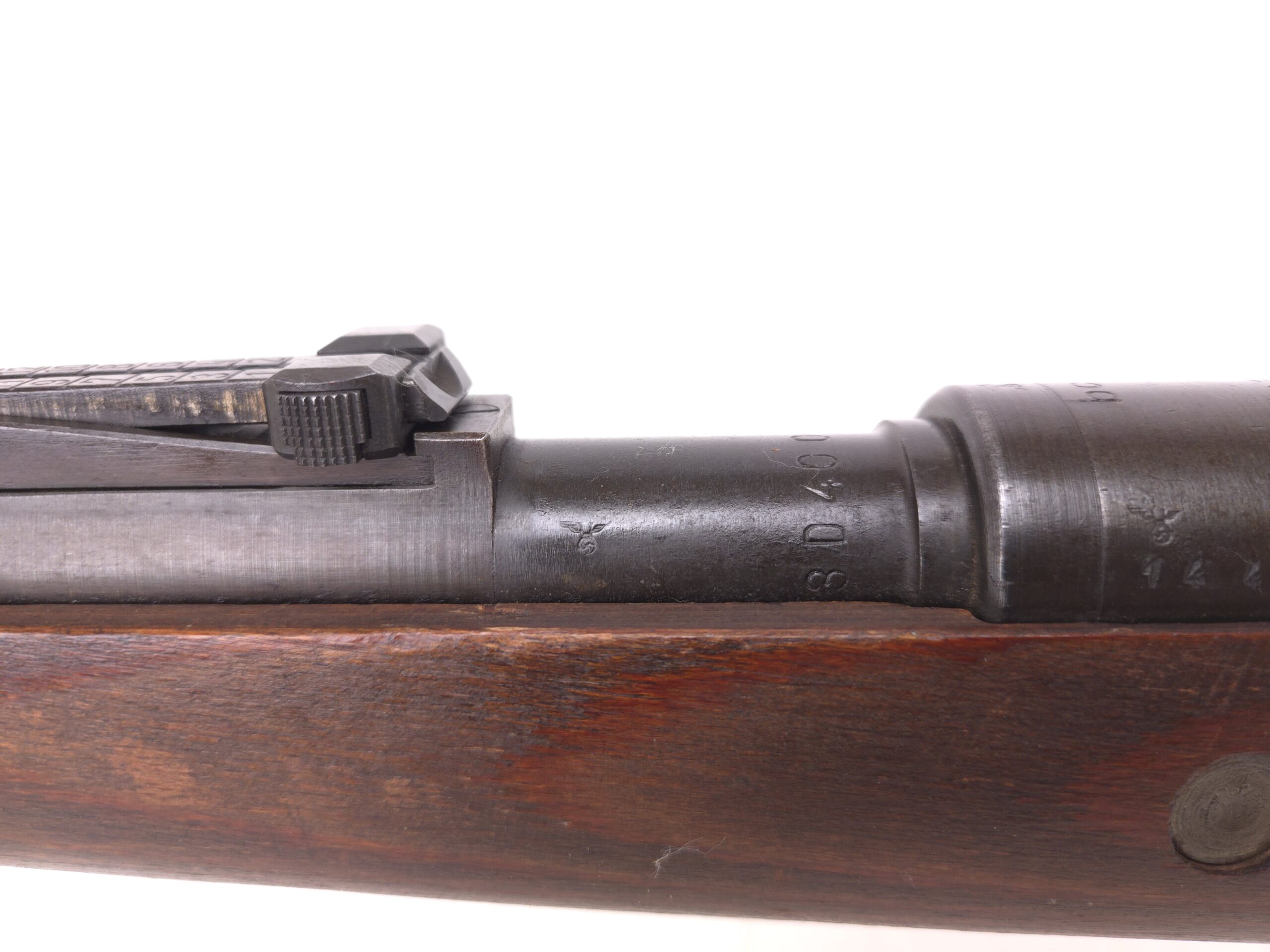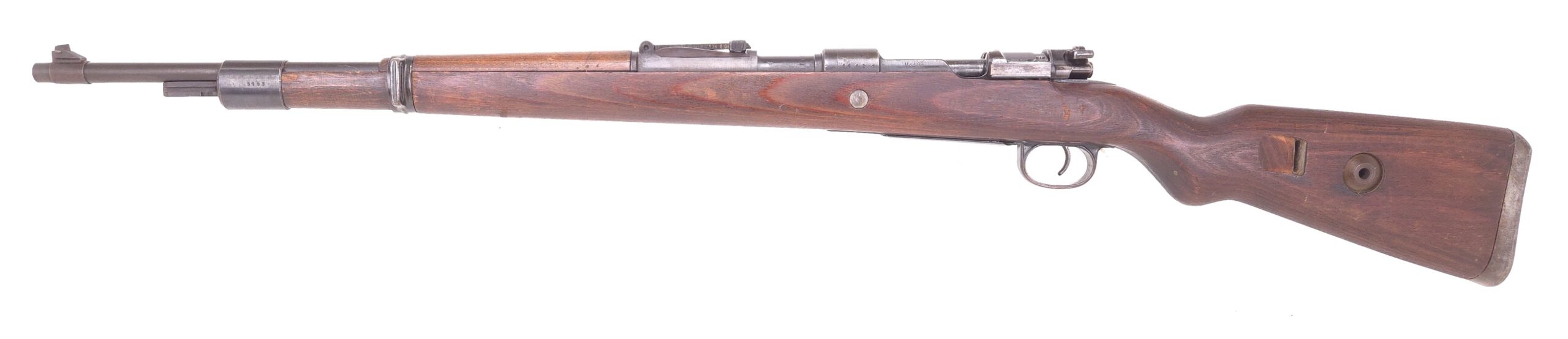 This is a very nice all original German K98 Mauser rifle that was manufactured in 1943 at the Gustloff Werke Factory. Mechanically this rifle is in excellent working order and is sure to be a great shooter. This rifle is not import marked. The stock has been duffle cut under the lower band. This rifle is a WWII bringback retaining all original matching parts with the exception of the barrel bands and handguard. This rifle is an excellent example of a WWII bringback K98 Mauser rifle that will make an awesome addition to your WWII rifle collection!