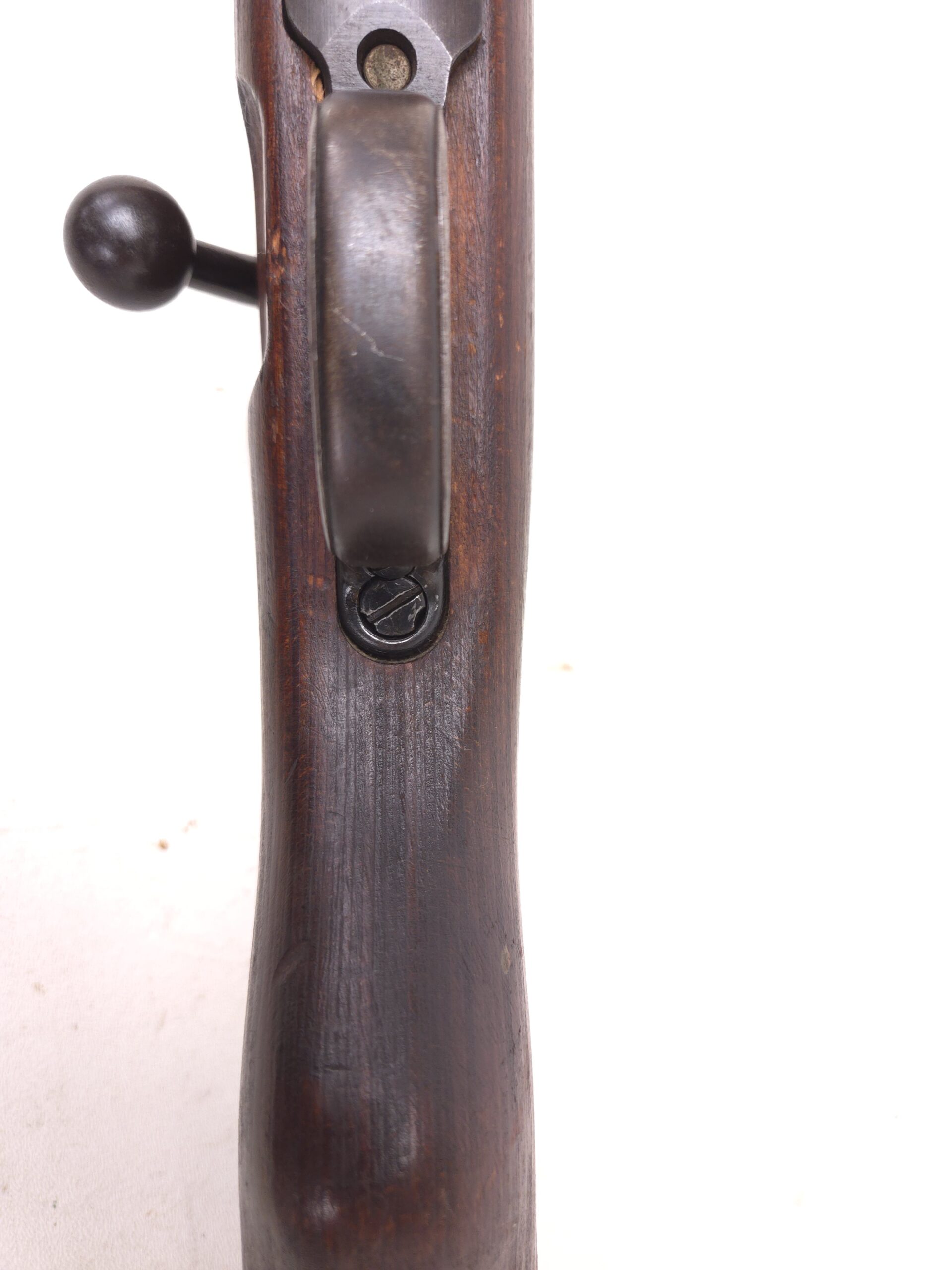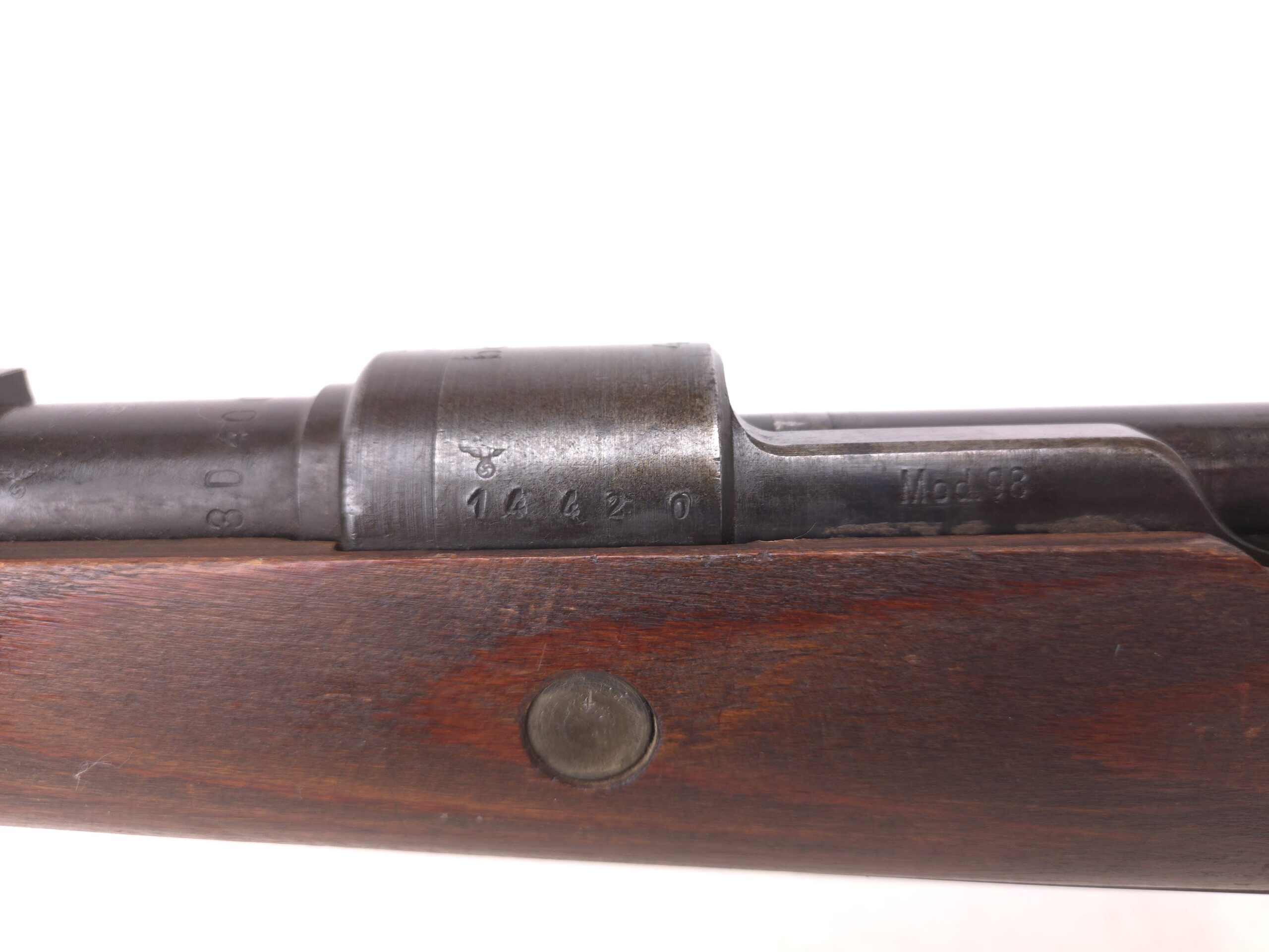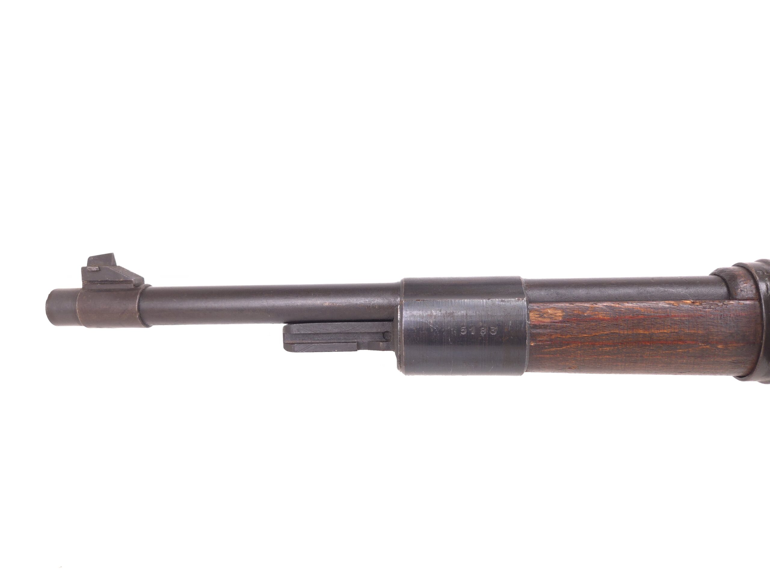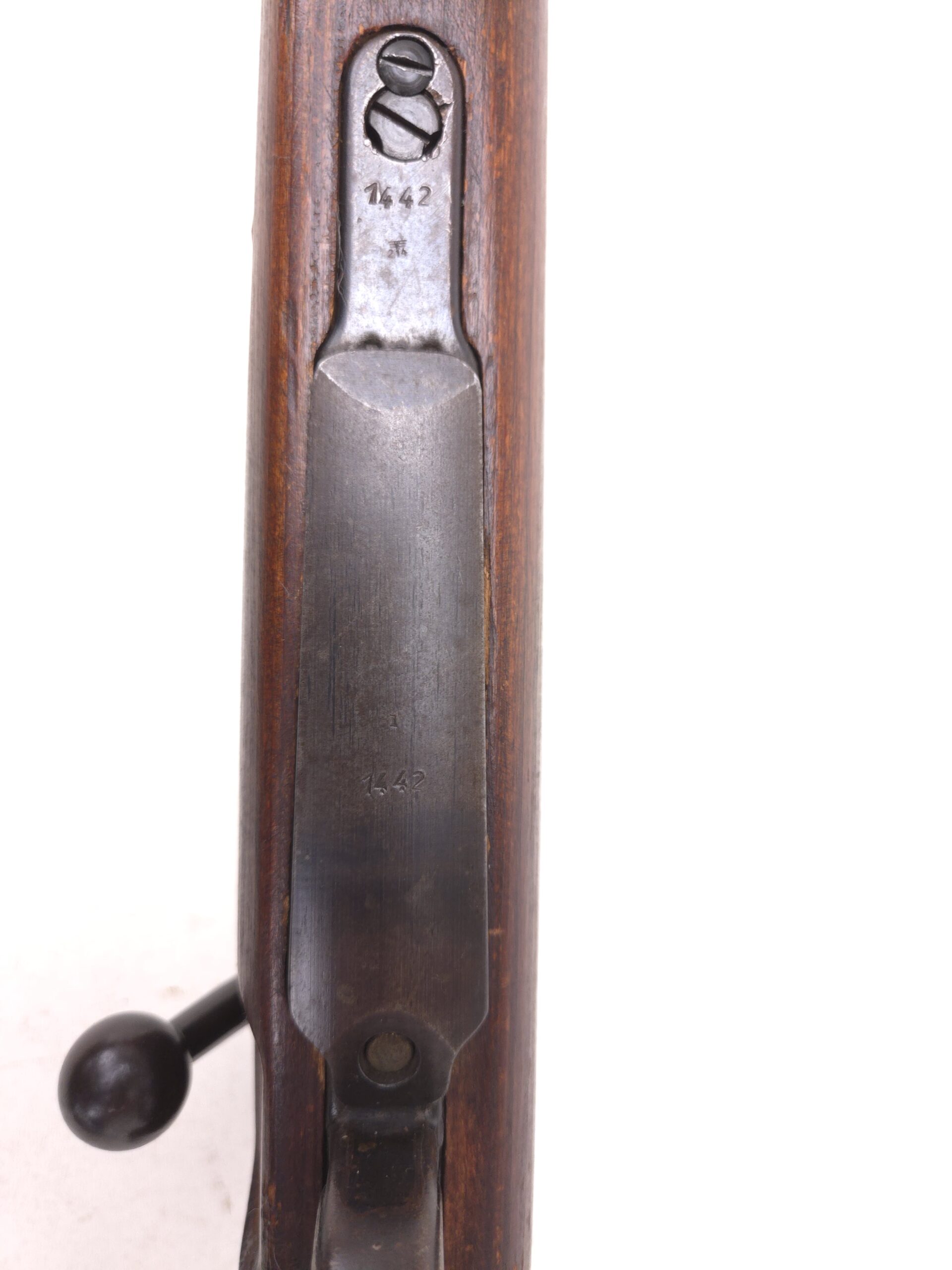 This is a very nice all original German K98 Mauser rifle that was manufactured in 1943 at the Gustloff Werke Factory. Mechanically this rifle is in excellent working order and is sure to be a great shooter. This rifle is not import marked. The stock has been duffle cut under the lower band. This rifle is a WWII bringback retaining all original matching parts with the exception of the barrel bands and handguard. This rifle is an excellent example of a WWII bringback K98 Mauser rifle that will make an awesome addition to your WWII rifle collection!