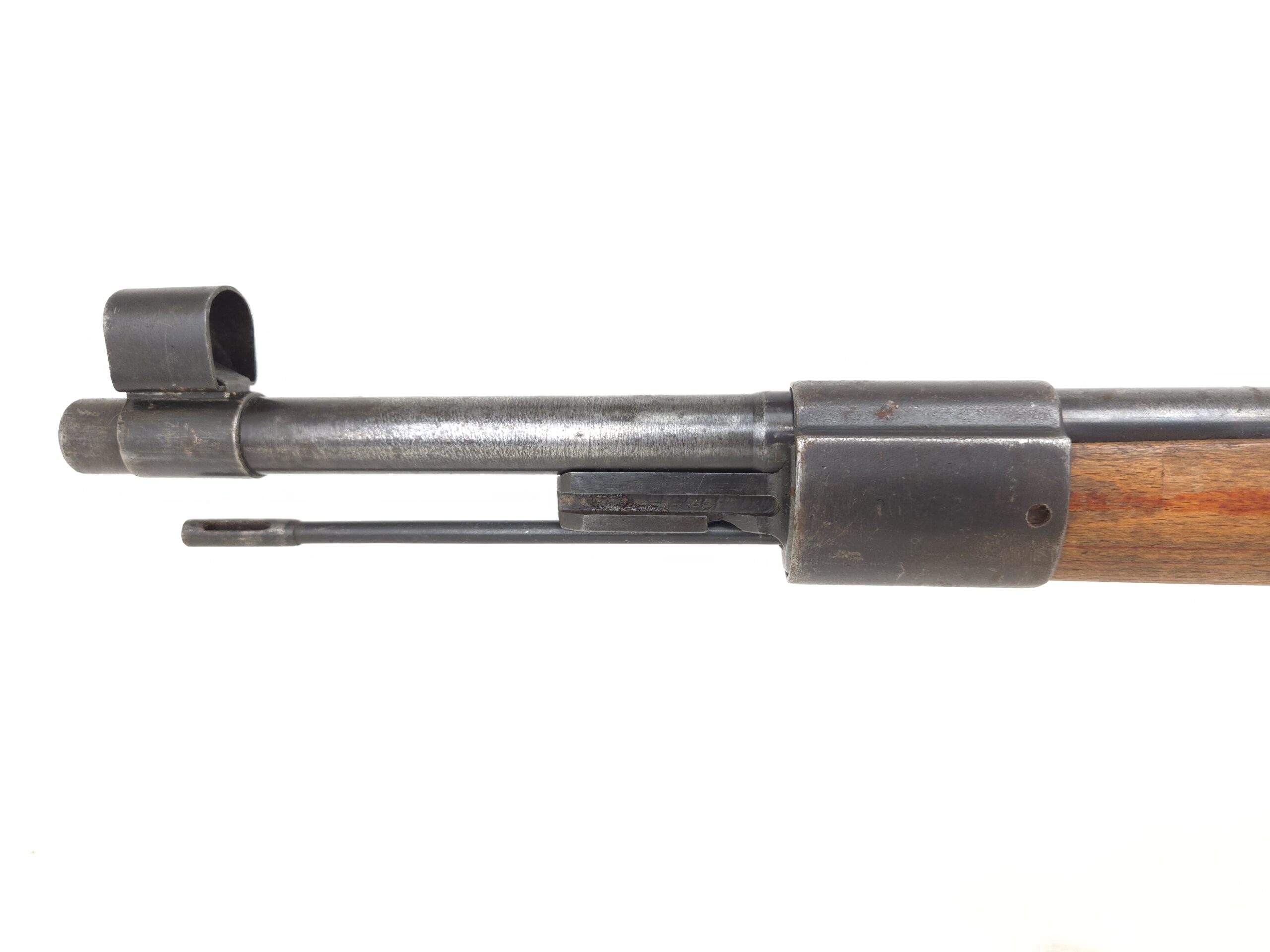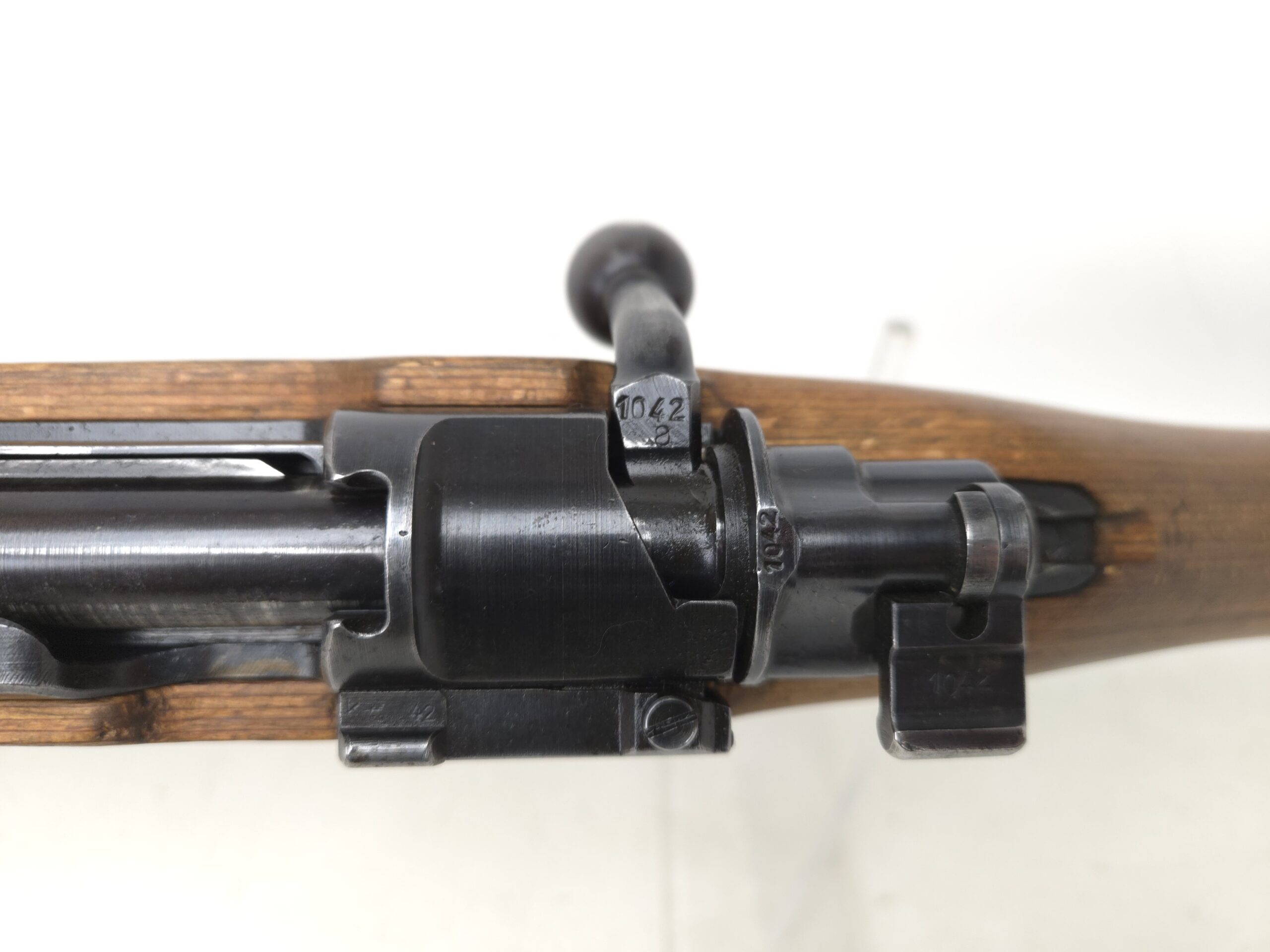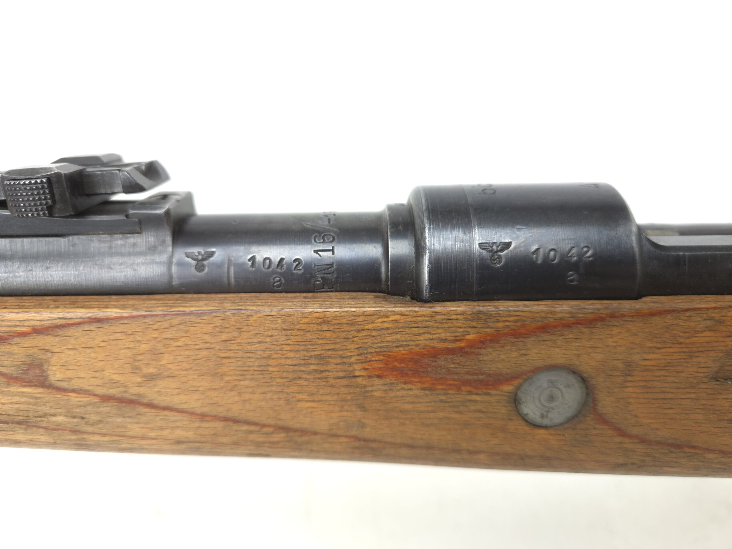 This is a very nice all original German K98 Mauser that was manufactured in 1941 at the Gustloff Werke Factory. Mechanically this rifle is in excellent working order and is a great shooter. This rifle is not import marked and appears to be all correct and original with the exception of an unnumbered front barrel band. The stock looks to have been duffle cut under the lower band. This rifle is complete with original cleaning rod and sight hood.